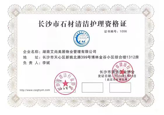 湖南艾尚美居物业管理有限公司获石材清洁护理资格证