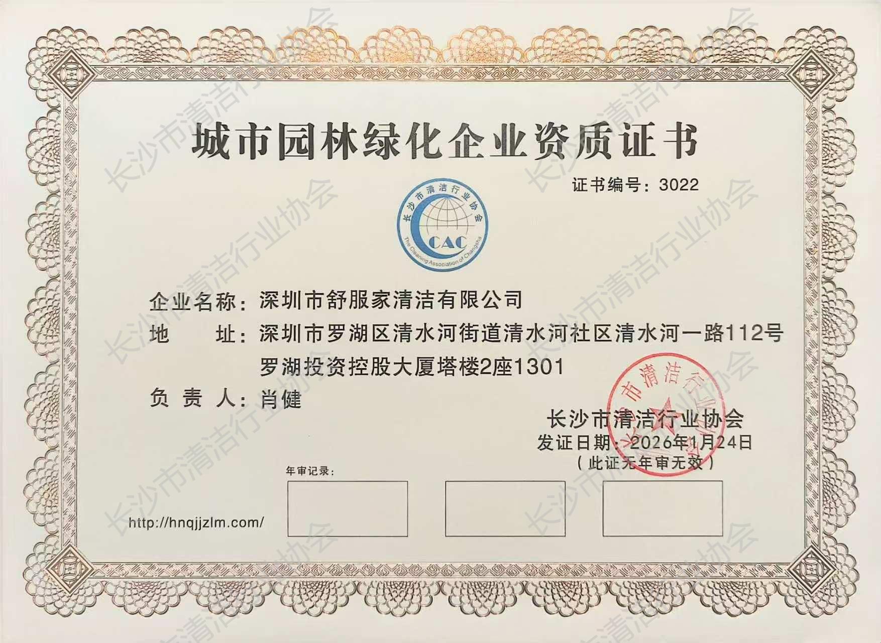 深圳市舒服家清洁有限公司获城市园林绿化企业资质证书