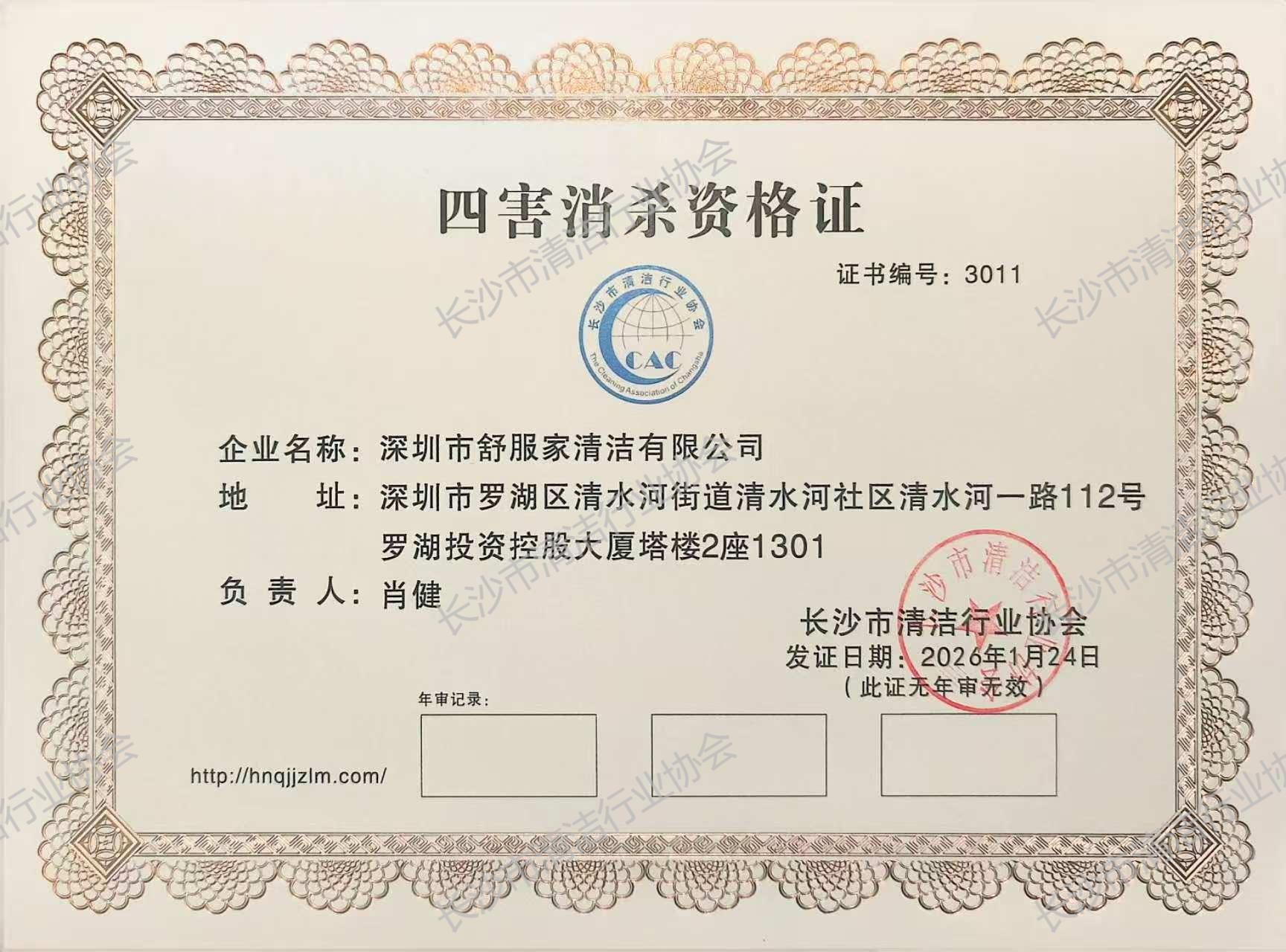 深圳市舒服家清洁有限公司获四害消杀资格证
