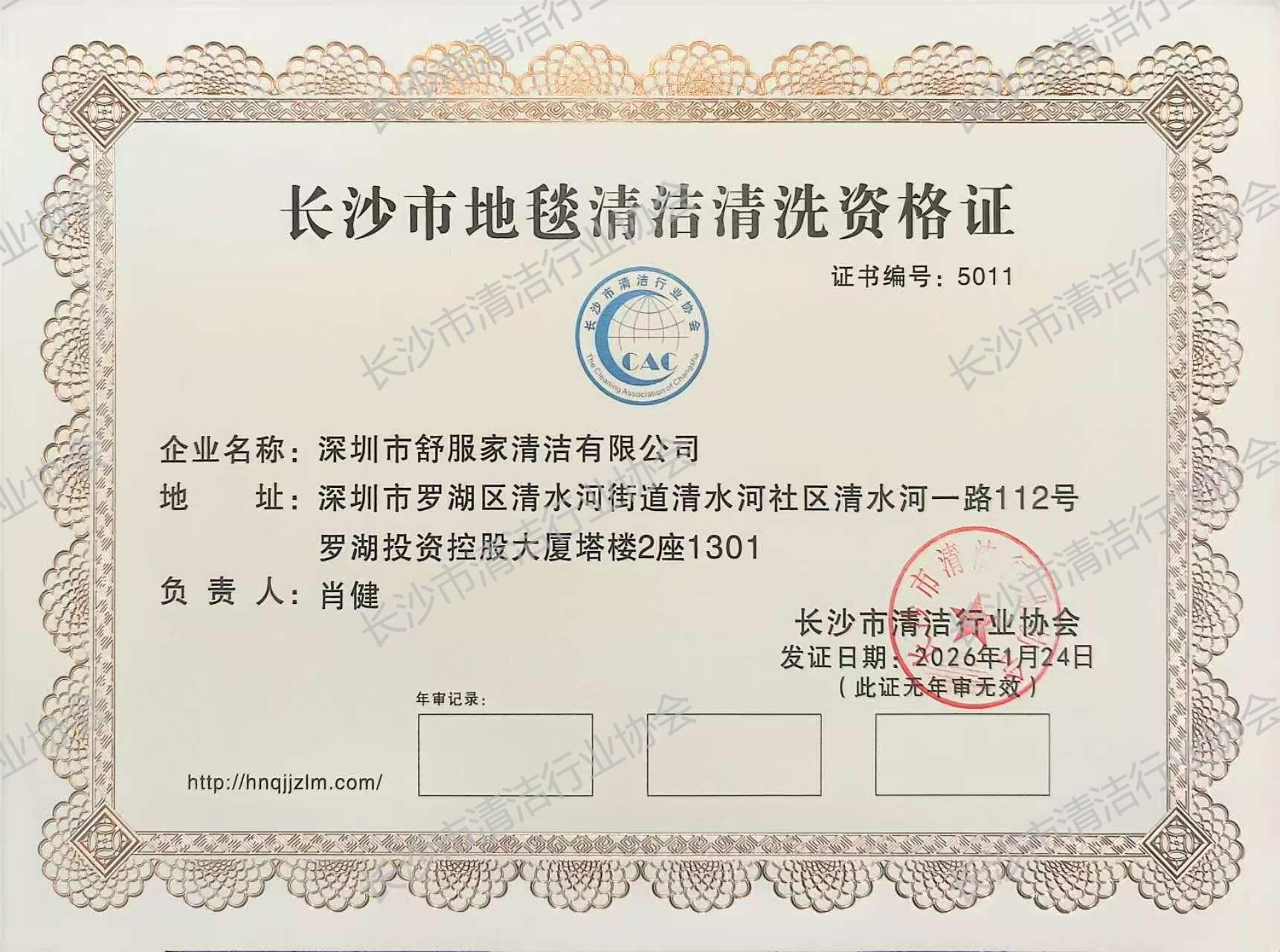 深圳市舒服家清洁有限公司获长沙市地毯清洁清洗资格证