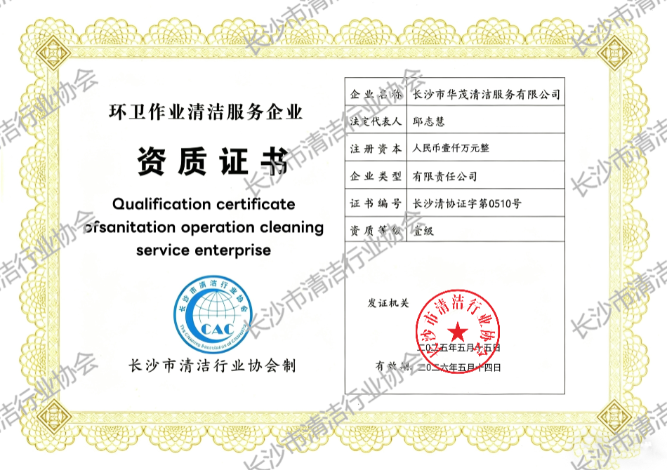 长沙市华茂清洁服务有限公司获环卫作业清洁服务企业资质证书