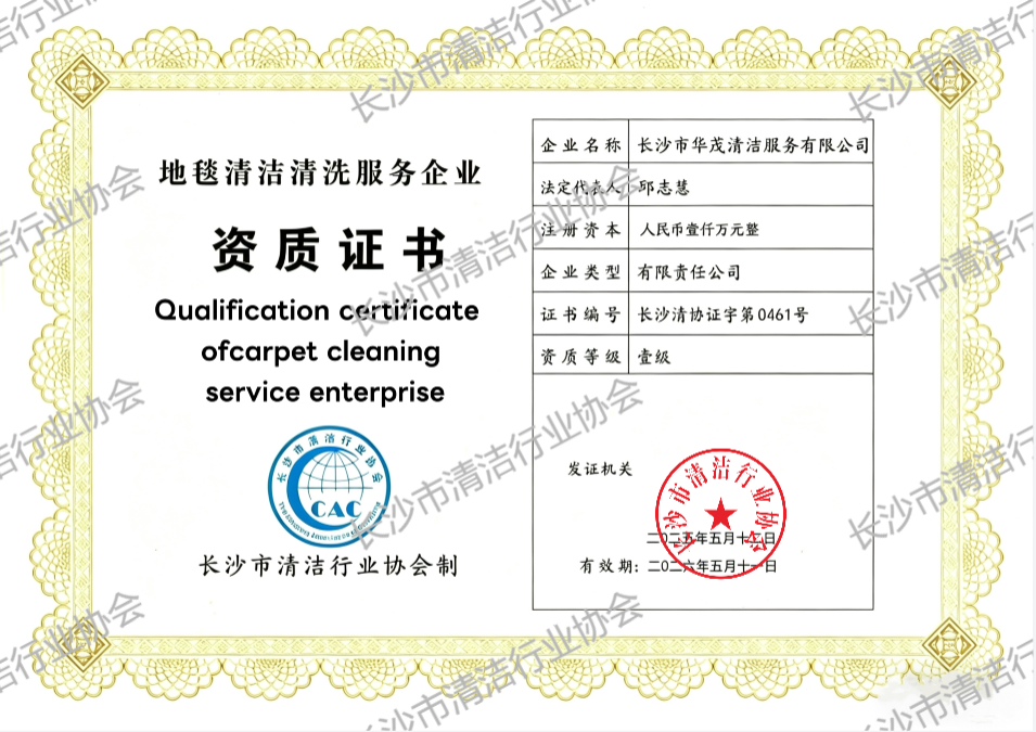 长沙市华茂清洁服务有限公司获地毯清洁清洗服务企业资质证书