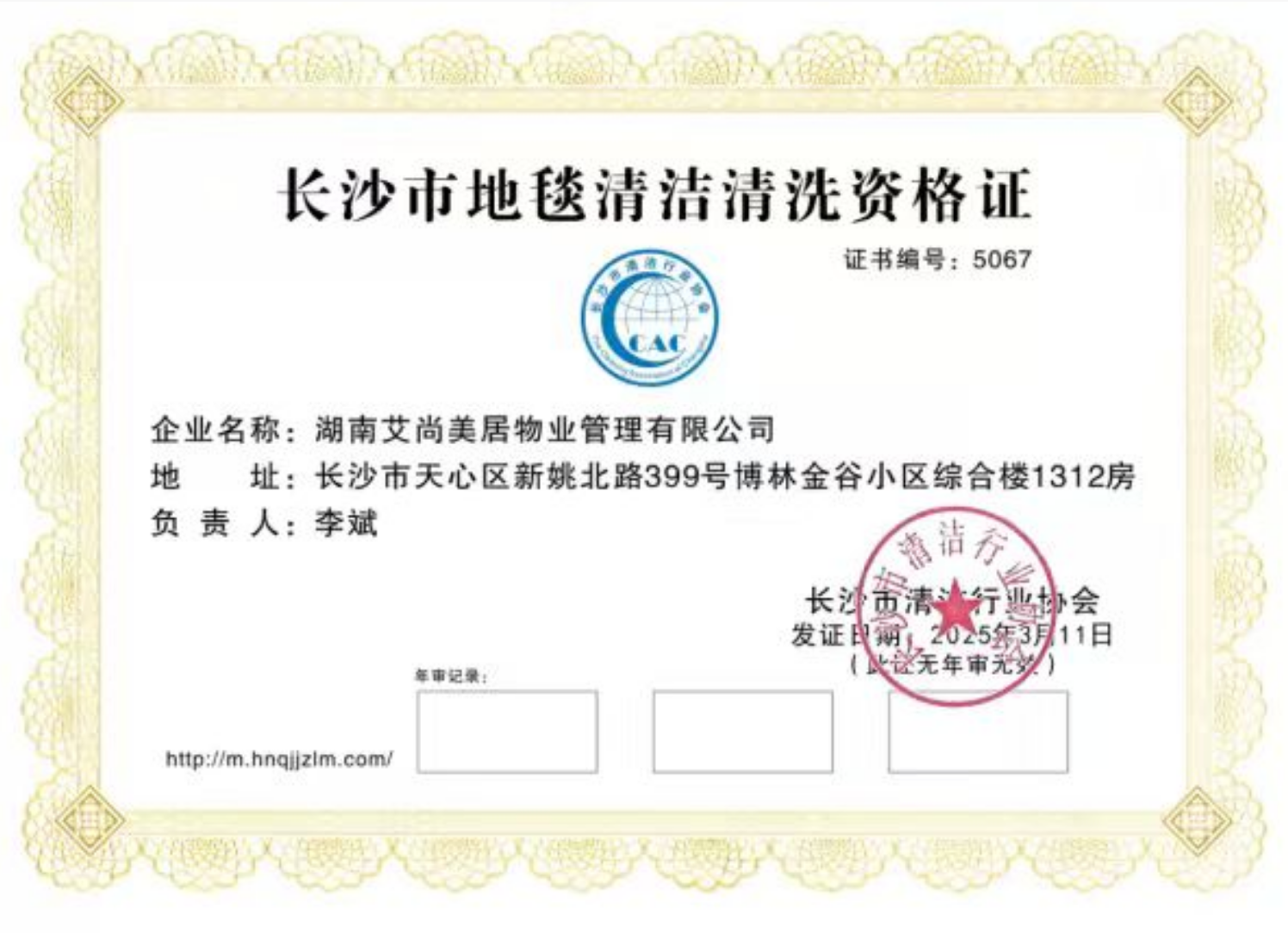 湖南艾尚美居物业管理有限公司获长沙市地毯清洁清洗资格证