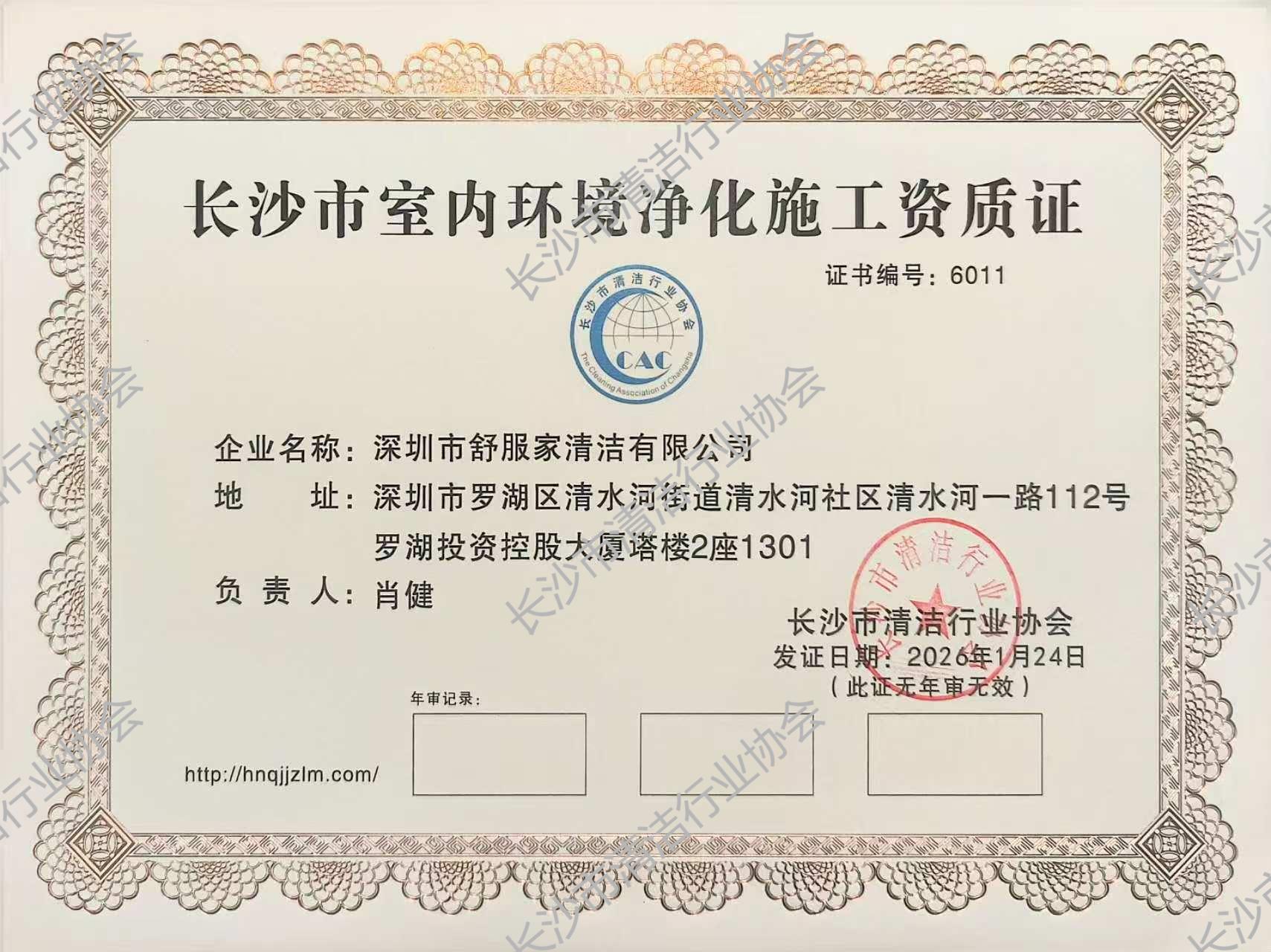 深圳市舒服家清洁有限公司获长沙市室内环境净化施工资质证