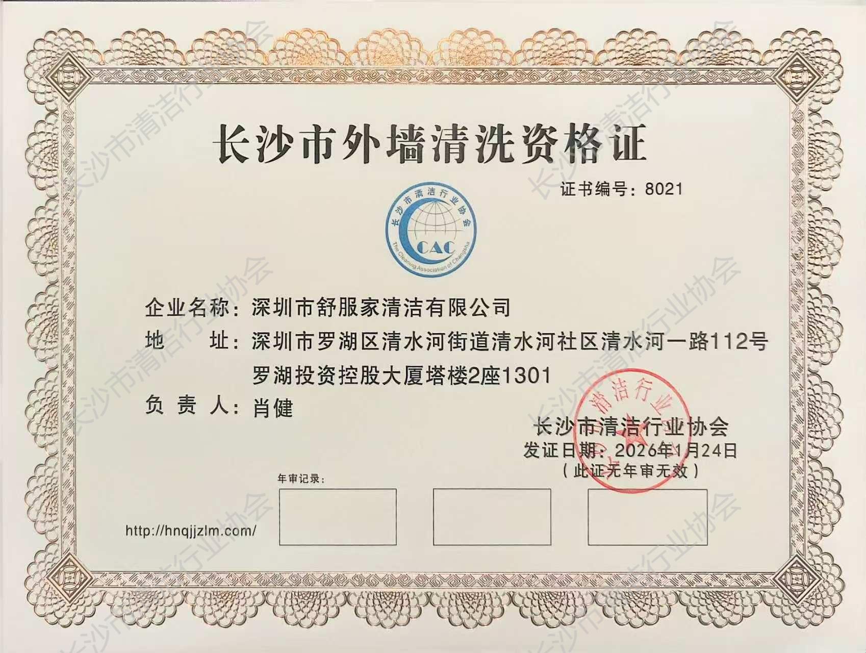 深圳市舒服家清洁有限公司获长沙市外墙清洗资格证