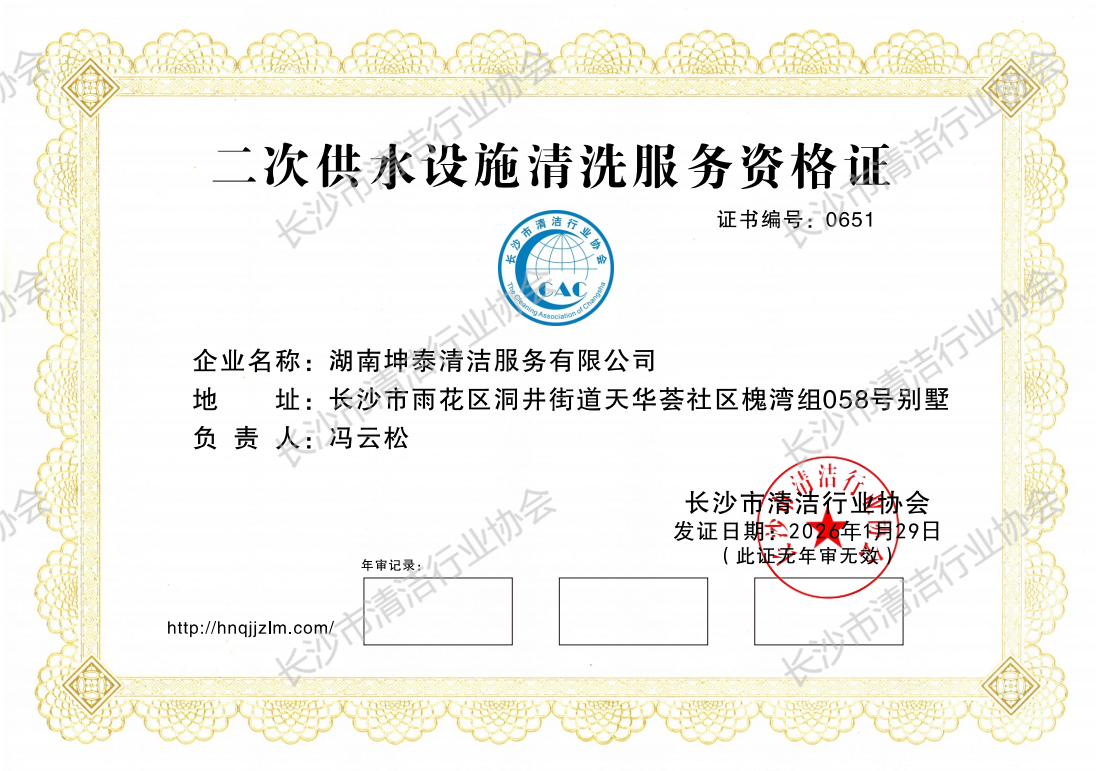 湖南坤泰清洁服务有限公司获二次供水设施清洗服务资格证