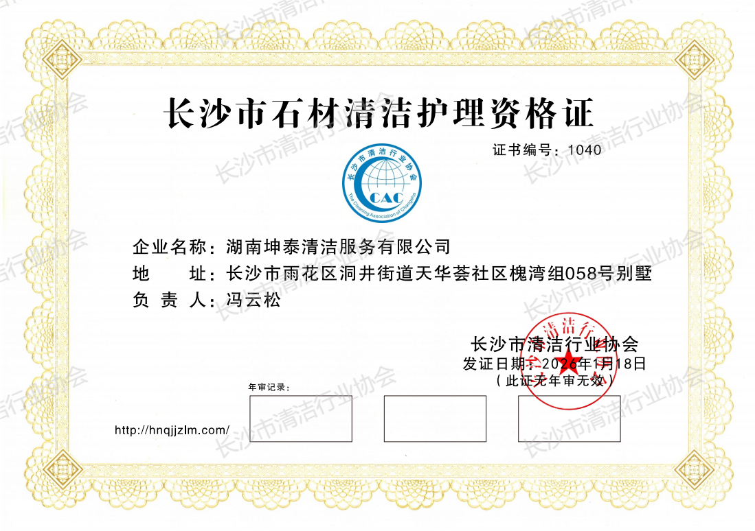 湖南坤泰清洁服务有限公司获长沙市石材清洁护理资格证